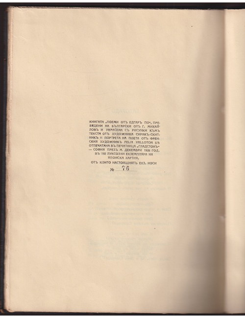- Състояние: Добро (Леки забележки по кориците и следи от навлажняване по задната корица. Библиофилски екземпляр № 76 от общо 150 отпечатани луксозн)