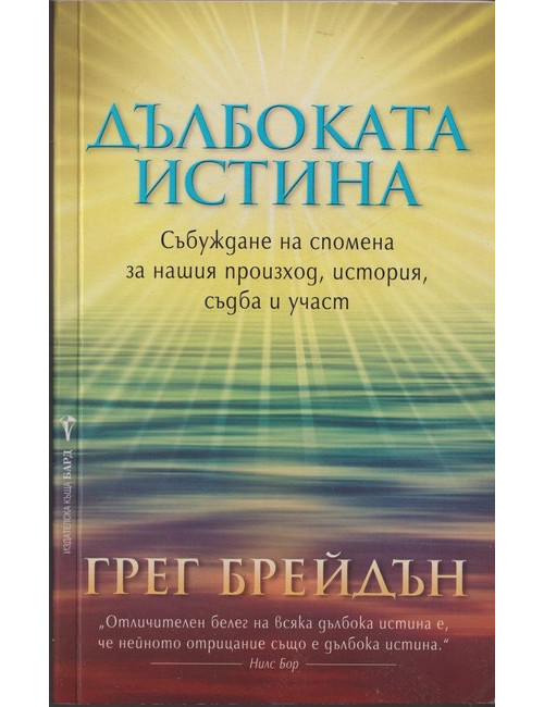Пред очите ни се очертава един нов свят. А неустойчивият свят от миналото се бори, за да продължи съществуването си. И двата свята отразяват убежденията от нашето минало. . И двата съществуват... засега. Кой свят избирате? Авторът на бестселъри и учен визионер Грег Брейдън предполага, че най- наболелите въпроси, които ни разделят - привидно толкова различни: война, тероризъм, аборт, самоубийство, геноцид, смъртно наказание, бедност, икономически крах и ядрена война - всъщност са взаимосвързани. Всички те произлизат от погрешните предположения на една остаряла наука, които са ни довели до ръба на катастрофата и риска да изгубим всичко ценно за нас като цивилизация. “Дълбока истина” разкрива убедителни доказателства, че: еволюцията сама по себе си не обяснява съществуването ни на Земята сме много по-отдавна, отколкото се признава от конвенционалната история не сме създадени за война, а за мир намираме се в преломен момент от съществуването си. Тези открития ни дават причини да мислим различно за самите себе си. Така решенията стават очевидни, а изборите - ясни! Грег Брейдън съчетава вдъхновяващите послания от целия си предишен визионерски труд в една обща визия за бъдещето на човечеството.